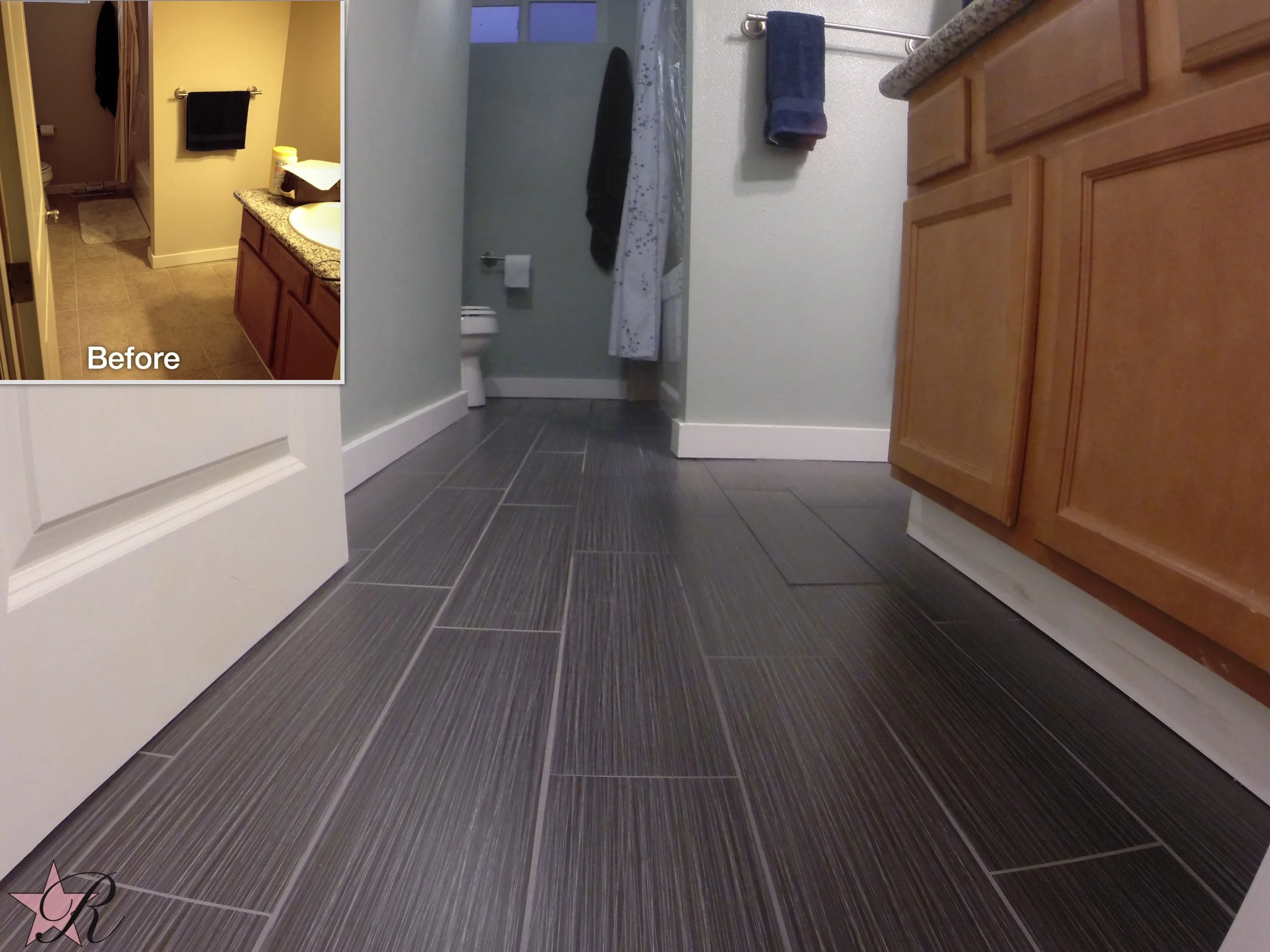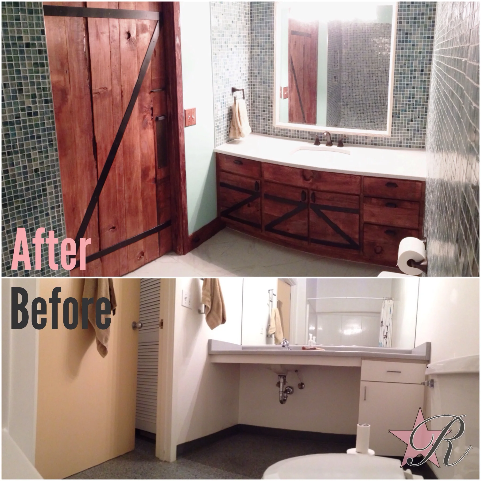 Rockstar Remodel demo'd the old bathroom and installed a glass mosaic shower that wrapped around the bathroom. The door and vanity were custom-made per client's inspirations.